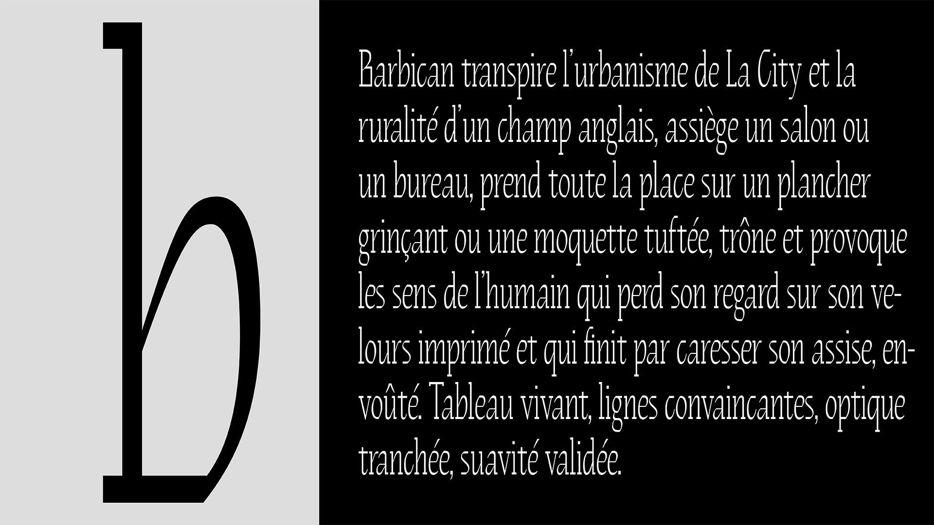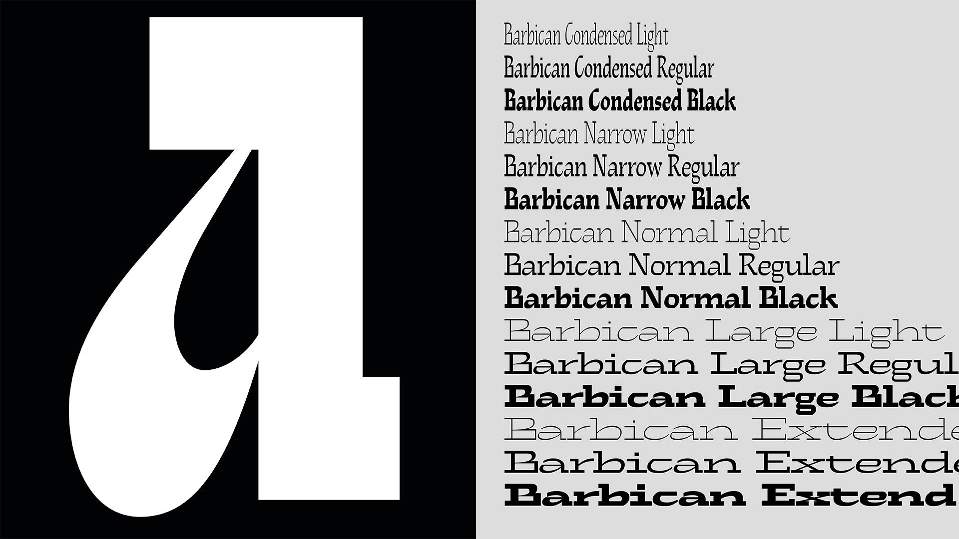 Barbican is a typeface family inspired by the brutalist architecture of the Barbican Centre in London.