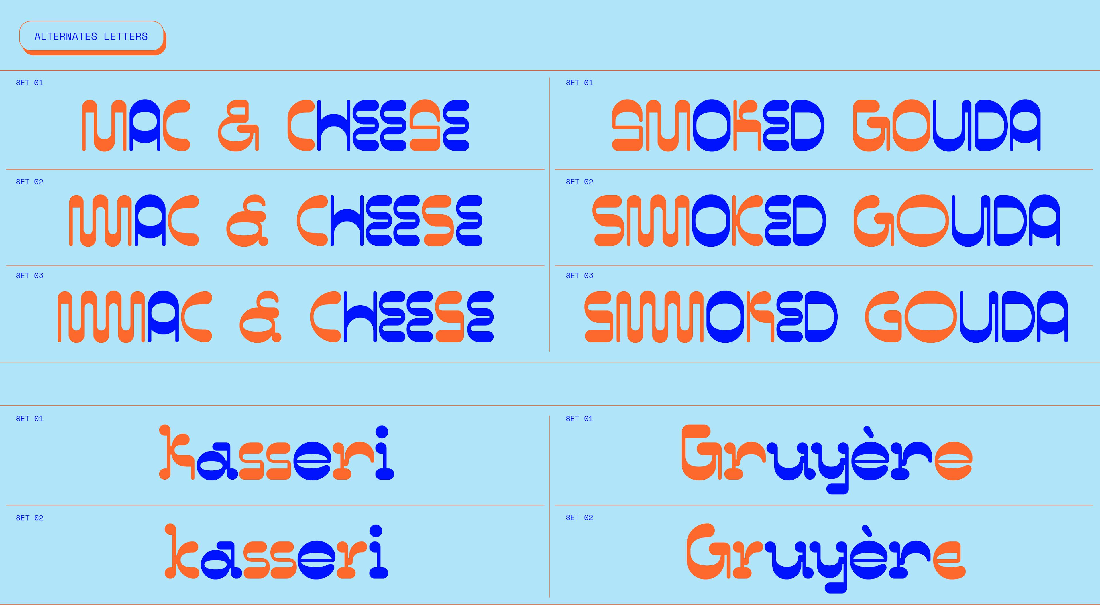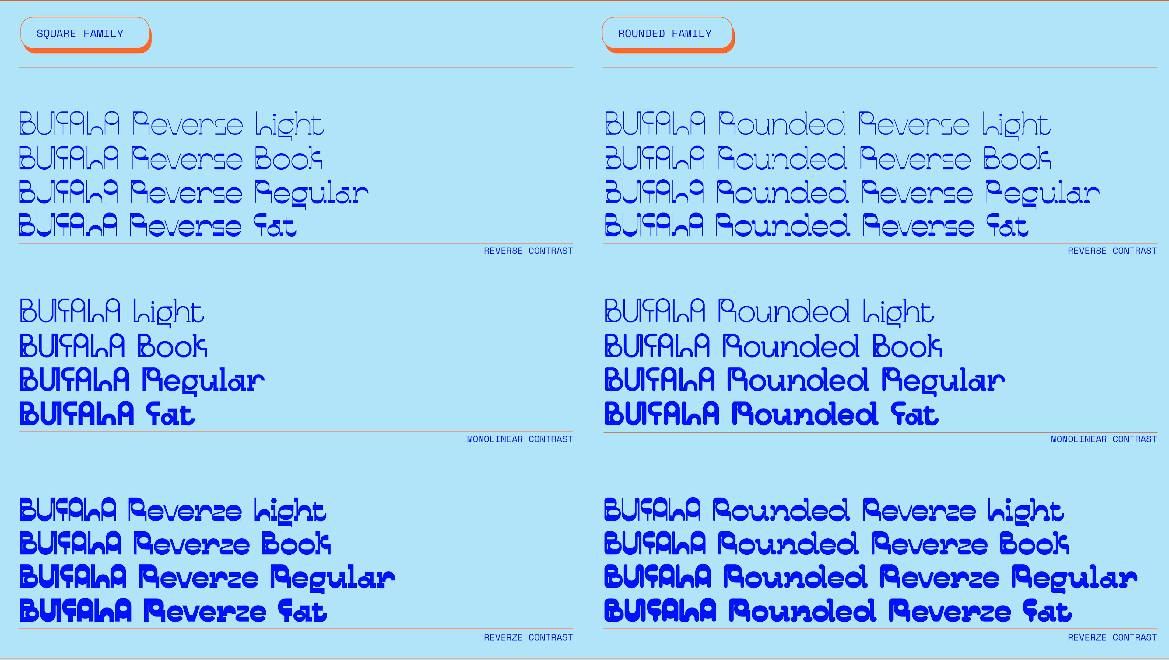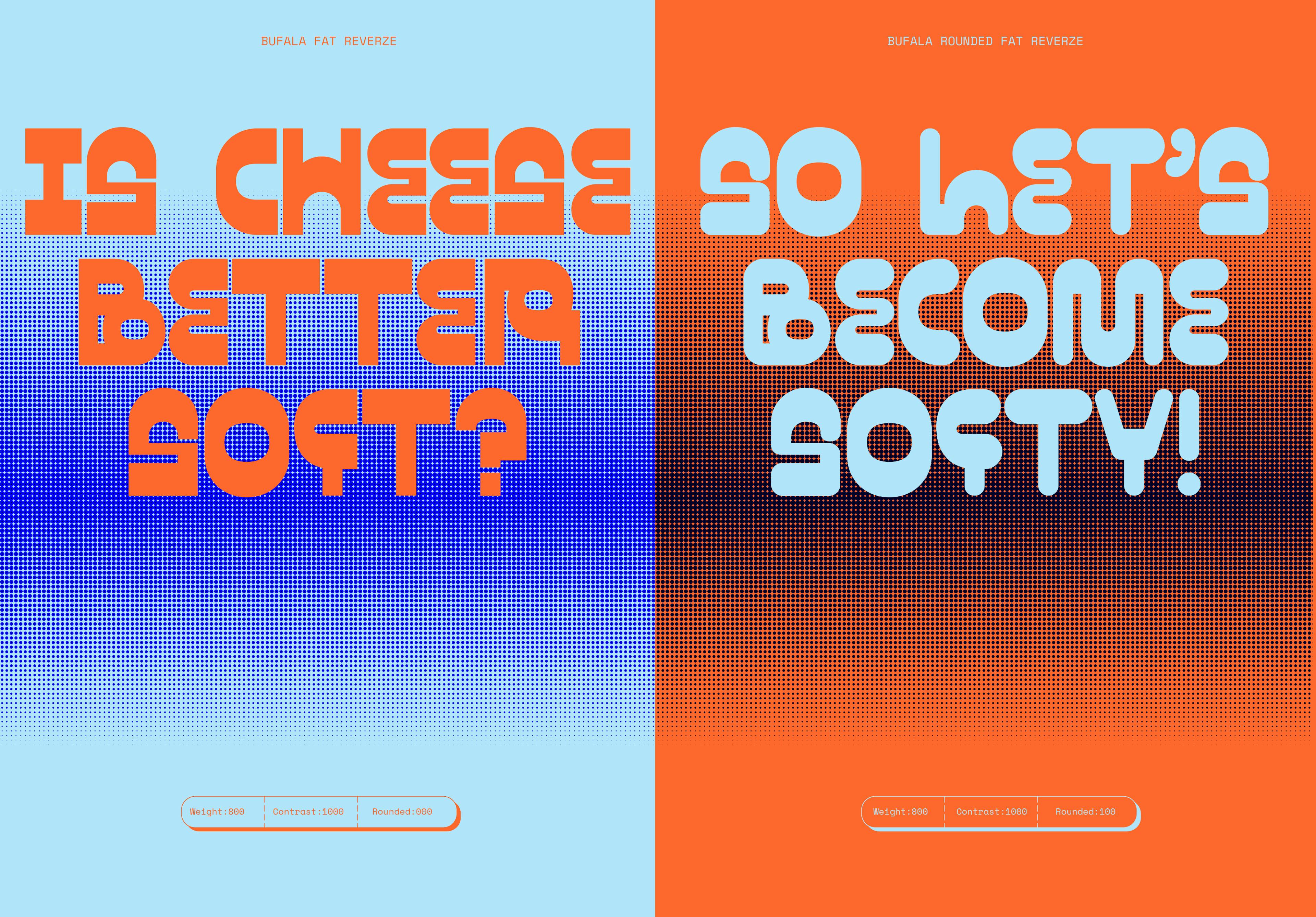 Originally inspired by the geometric shapes of Italian design from the 1960s, this playful and geometric typeface is an invitation to return to childhood. It is diversified into numerous weights to allow for style changes that make it unique. This versatile family is variable, and has been designed with three different contrasts ranging from light to fat, allowing a multitude of functionalities. Bufala has also been crafted to offer a soft version of typography with rounded angles that might just melt your heart like mozzarella.